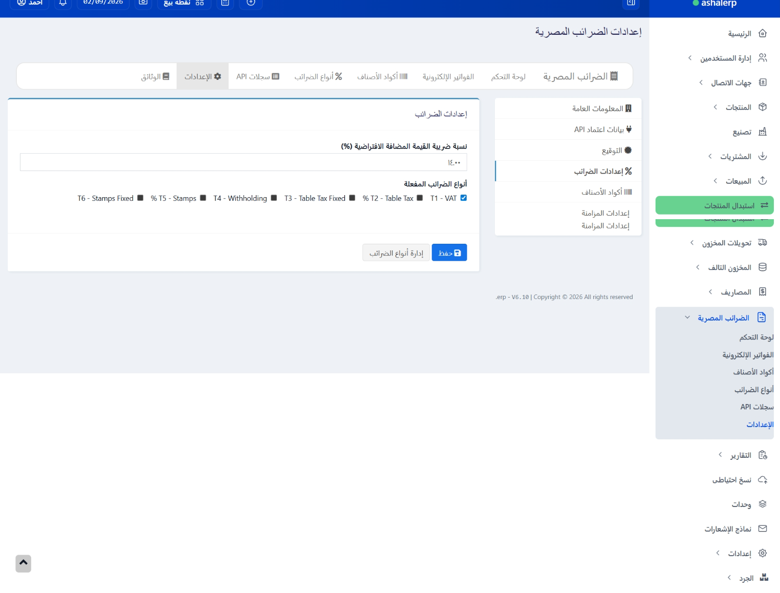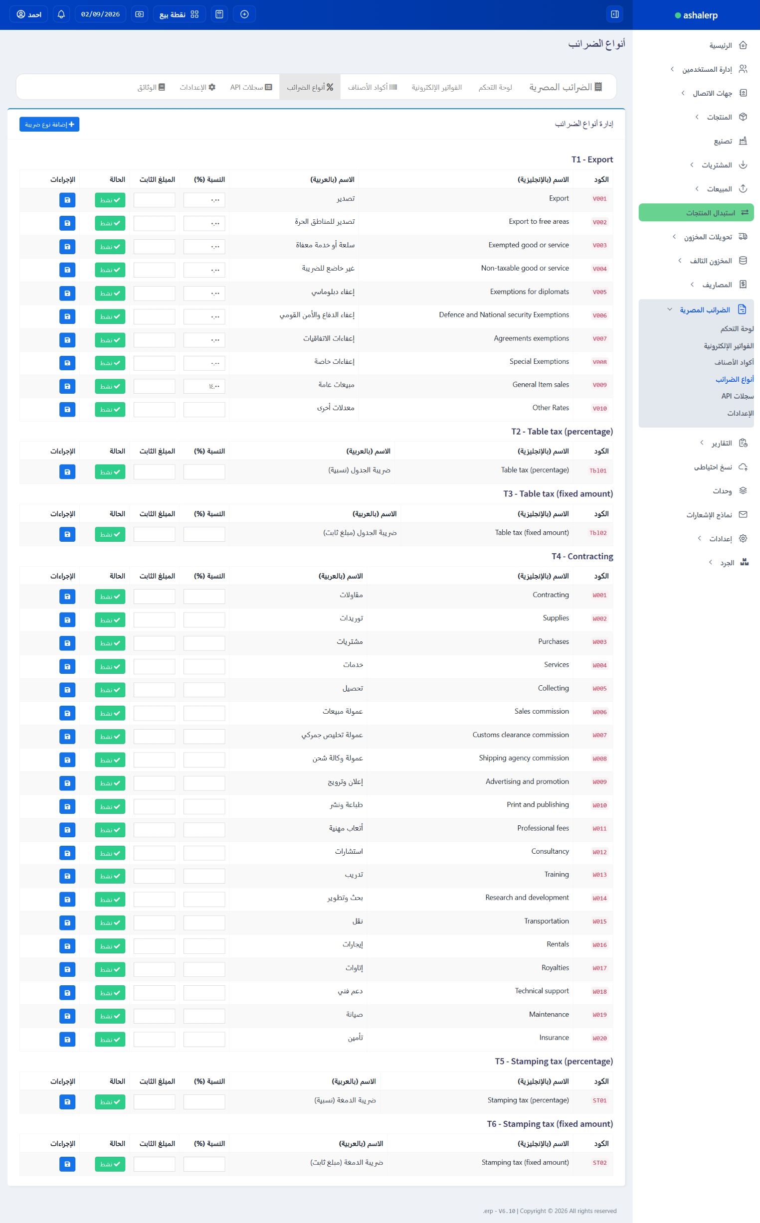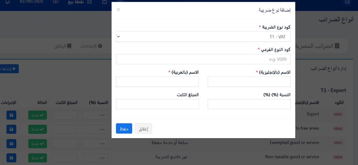 • دعم كامل لضريبة القيمة المضافة (VAT): ضبط مسبق لأنواع الضرائب المصرية المختلفة (T1, T2, إلخ) مع إمكانية إضافة أنواع مخصصة حسب طبيعة نشاطك.