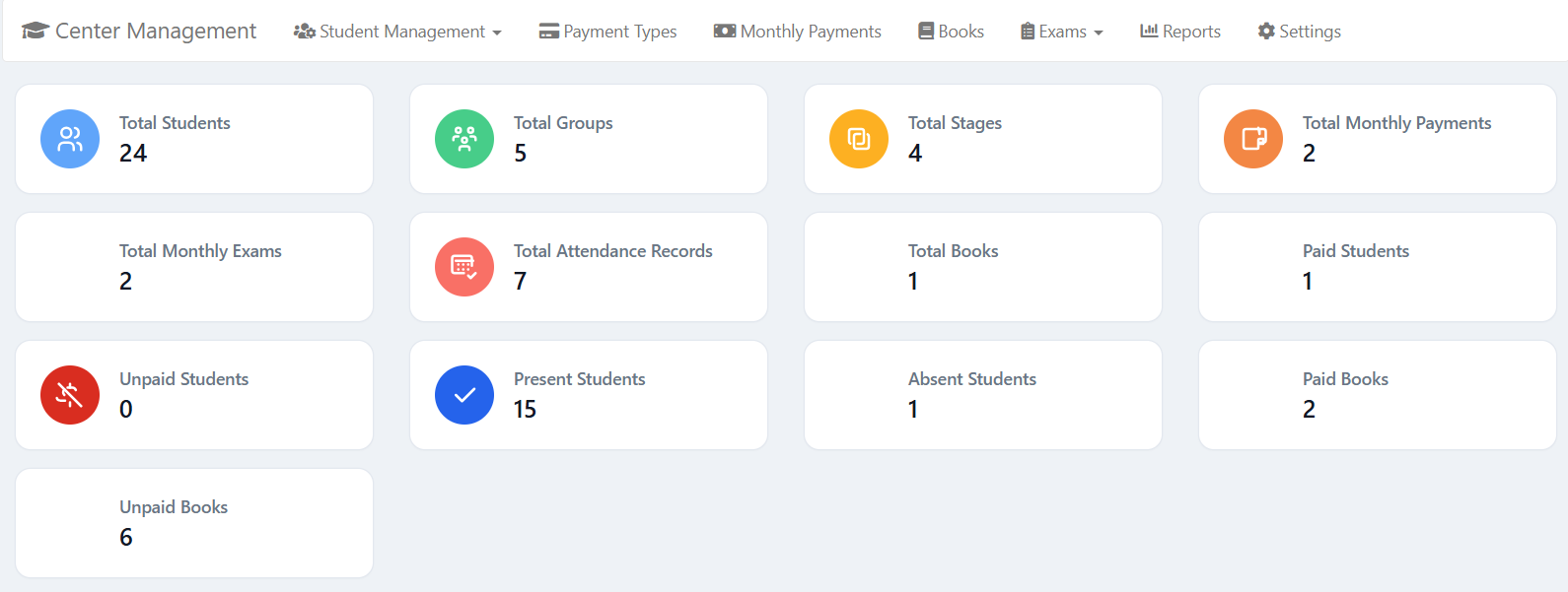• Interactive Dashboard: Displays key statistics, including total students, groups, stages, payments, exams, attendances, books, paid/unpaid students, present/absent students, and paid/unpaid books.