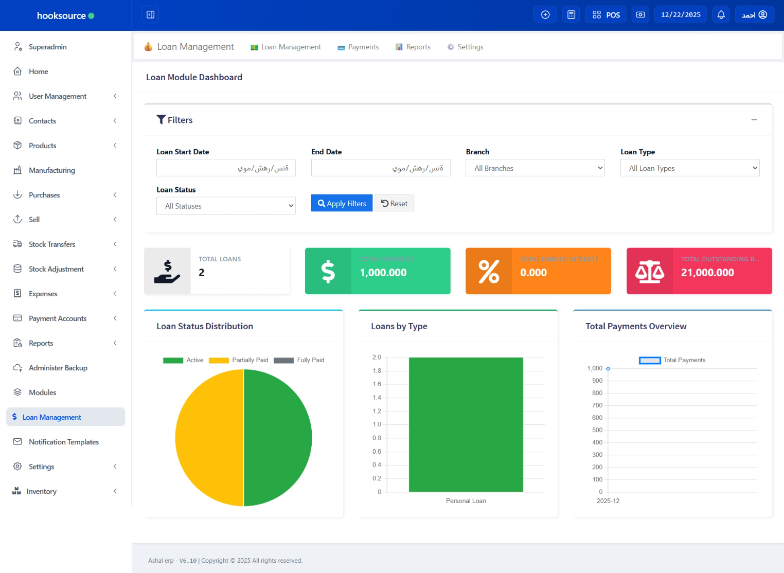 – New Feature: Added advanced filters (start date, end date, loan type, status, branch, total amount range) to loans, payments, reports, and dashboard for customizable data views.