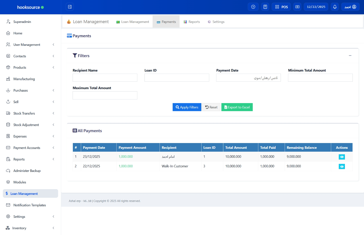 – New Feature: Added Excel export functionality for detailed loans in reports, supporting filtered data export.